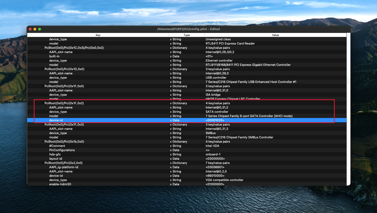 B6: Mở config lên vào mục device properties hoặc device ==> prperties nếu ở clover add 1 key với kiểu dữ liệu là dictionary và tên là device path vừa xác định ở trên sao đó add device-id vào với kiểu dữ liệu là data.