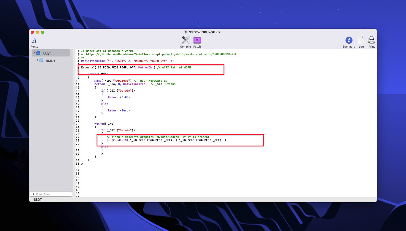 B3: Ta cần tiến hành đổi ACPI path trong SSDT thành ACPI path vừa xác định được. Cụ thể những phần cần đổi là
