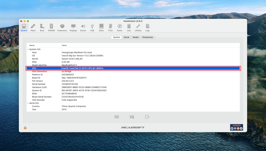 B3: Mở hackintool lên chú ý vào phần system ==> system info ==> CPU